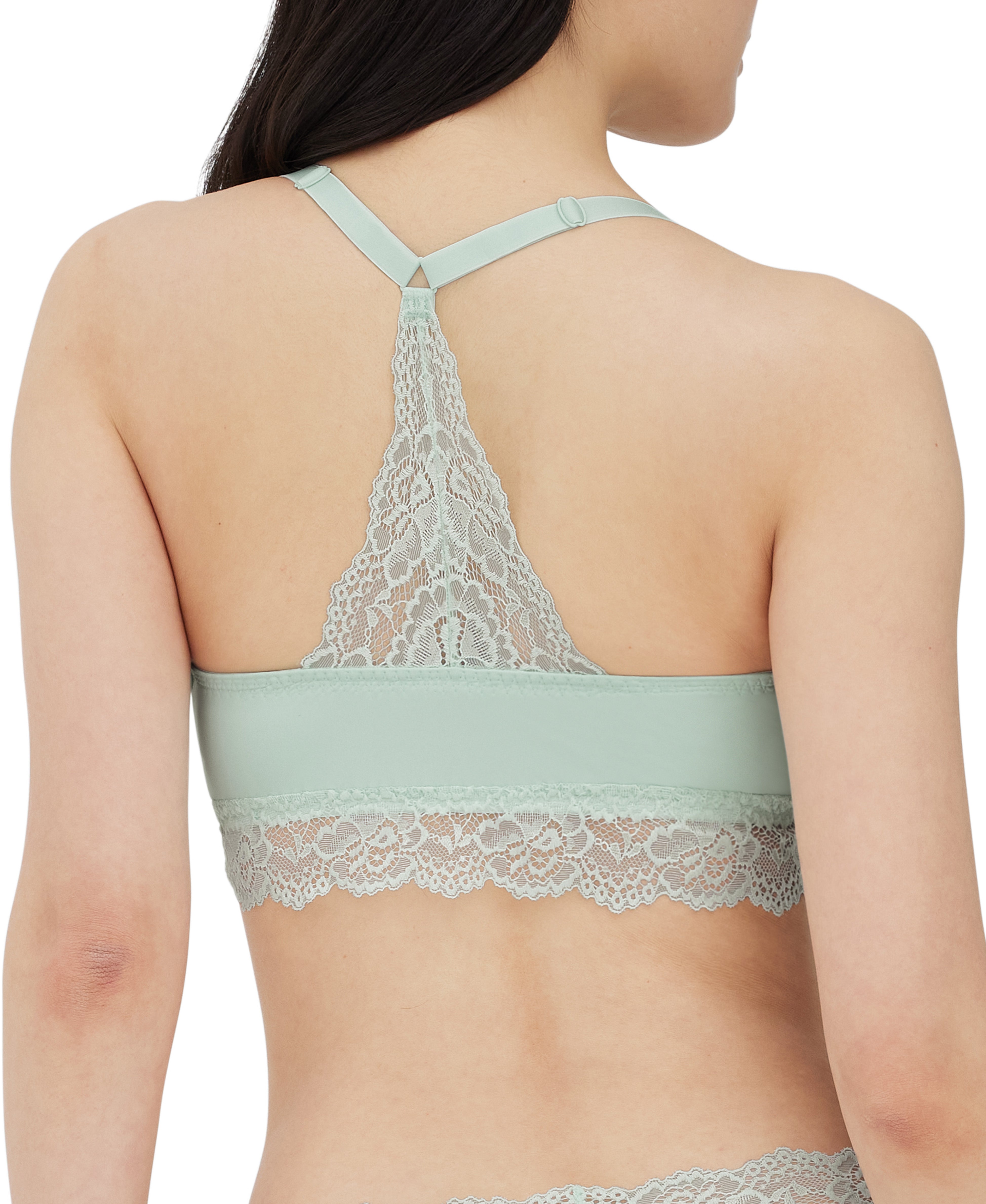 - Over the head style with dramatic lace racer back