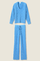 The ultimate in stay-home softness, this chenille cable knit pajama set pairs a relaxed V-neck pullover with matching drawstring pants. The bright blue hue adds a cheerful pop to cozy days and nights.
