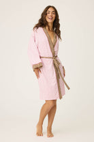 Prim with a pounce. This robe pairs dainty pink florals with bold leopard trim for a look that’s equal parts sweet and wild. Crafted from silky-soft jersey with wide sleeves and a relaxed shape, it’s the ultimate getaway layer—perfect for slow mornings, cozy nights, or tossed over a swimsuit as a playful cover-up.