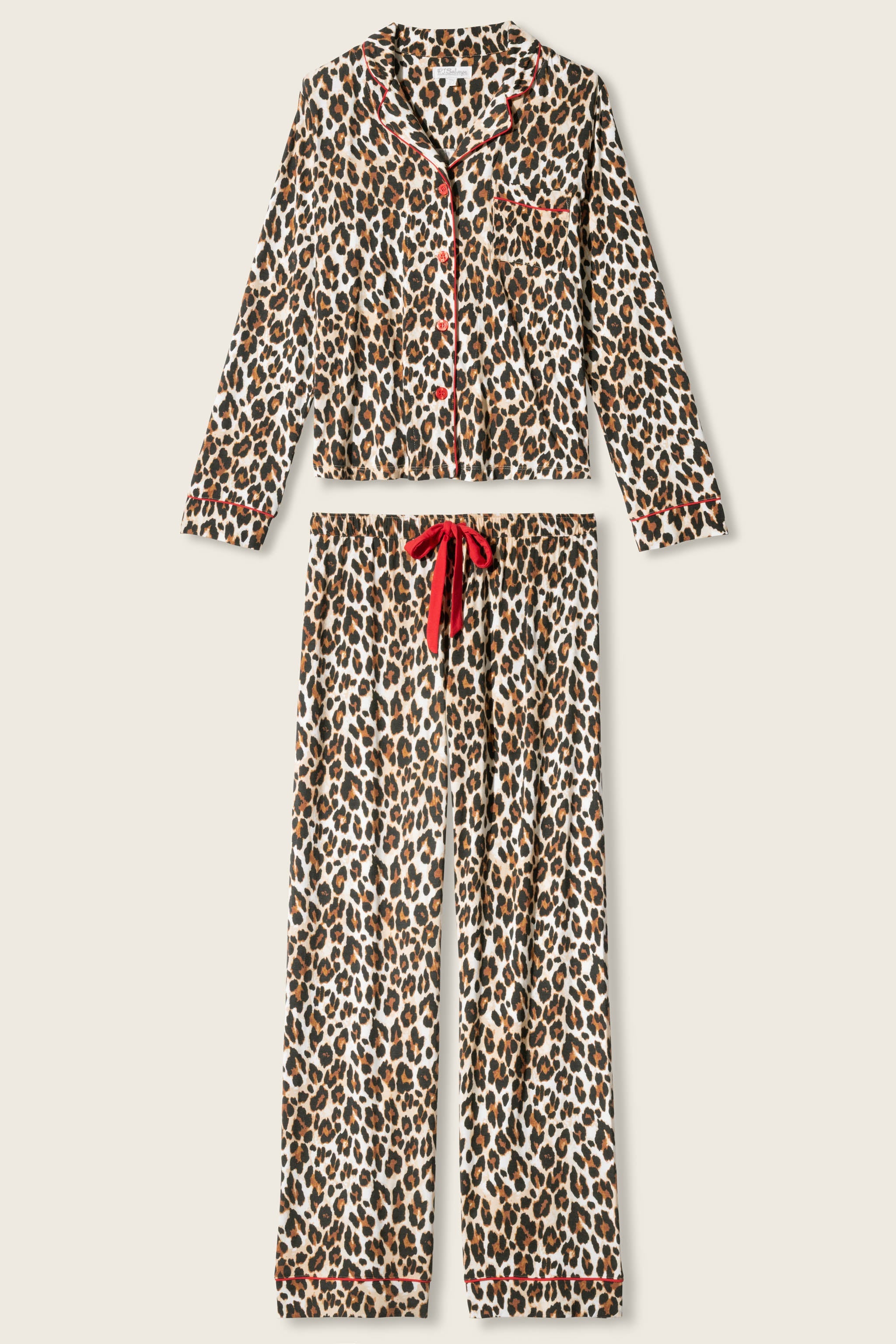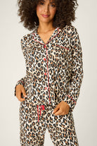 Unwind on the wild side in this modal jersey pajama set, patterned all over in leopard spots. The button-down top is finished with red piping and buttons, while the relaxed drawstring pants tie with a matching red ribbon—an easy way to add a fierce twist to cozy nights in.