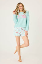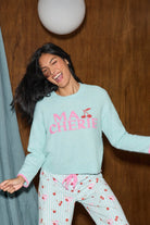Soft, fuzzy, and made to be lived in—this snuggle sweater brings serious lounge appeal. The minty green knit is plush and stretchy with a relaxed fit, finished with a sweet cherry and pink “ma chérie” graphic. It’s the kind of layer that’s made for slow days and sweet moments at home.