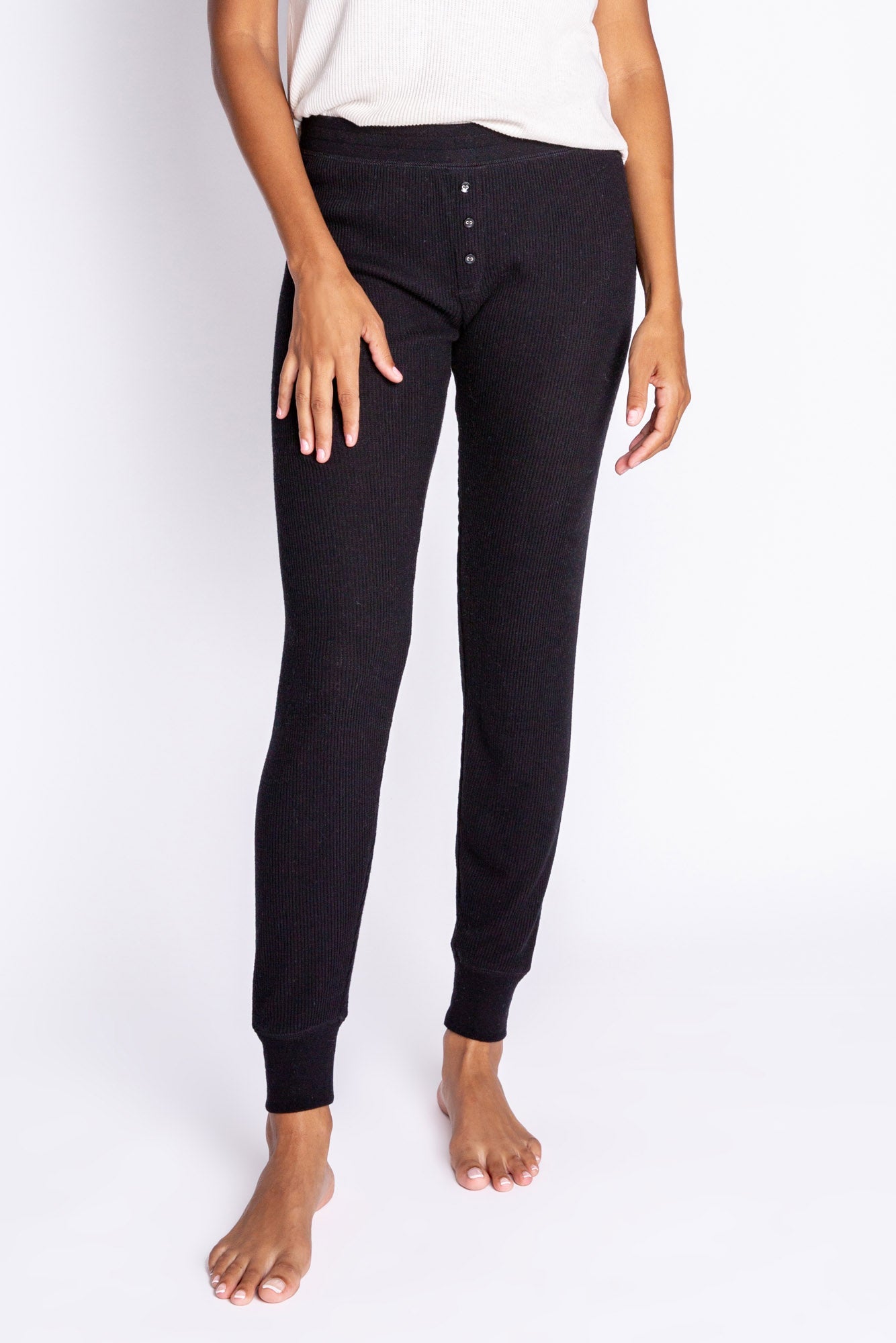 The world's best hybrid-lounge-pant. Part slimline jammie pant, part versatile jogger. The pair you'll grab for their super soft 2x2 rib in peachy jersey. Clean front with three faux button fly. Truly, essential. Care tip: we don’t mix our fleece with towels or other rough laundry to minimize piling.