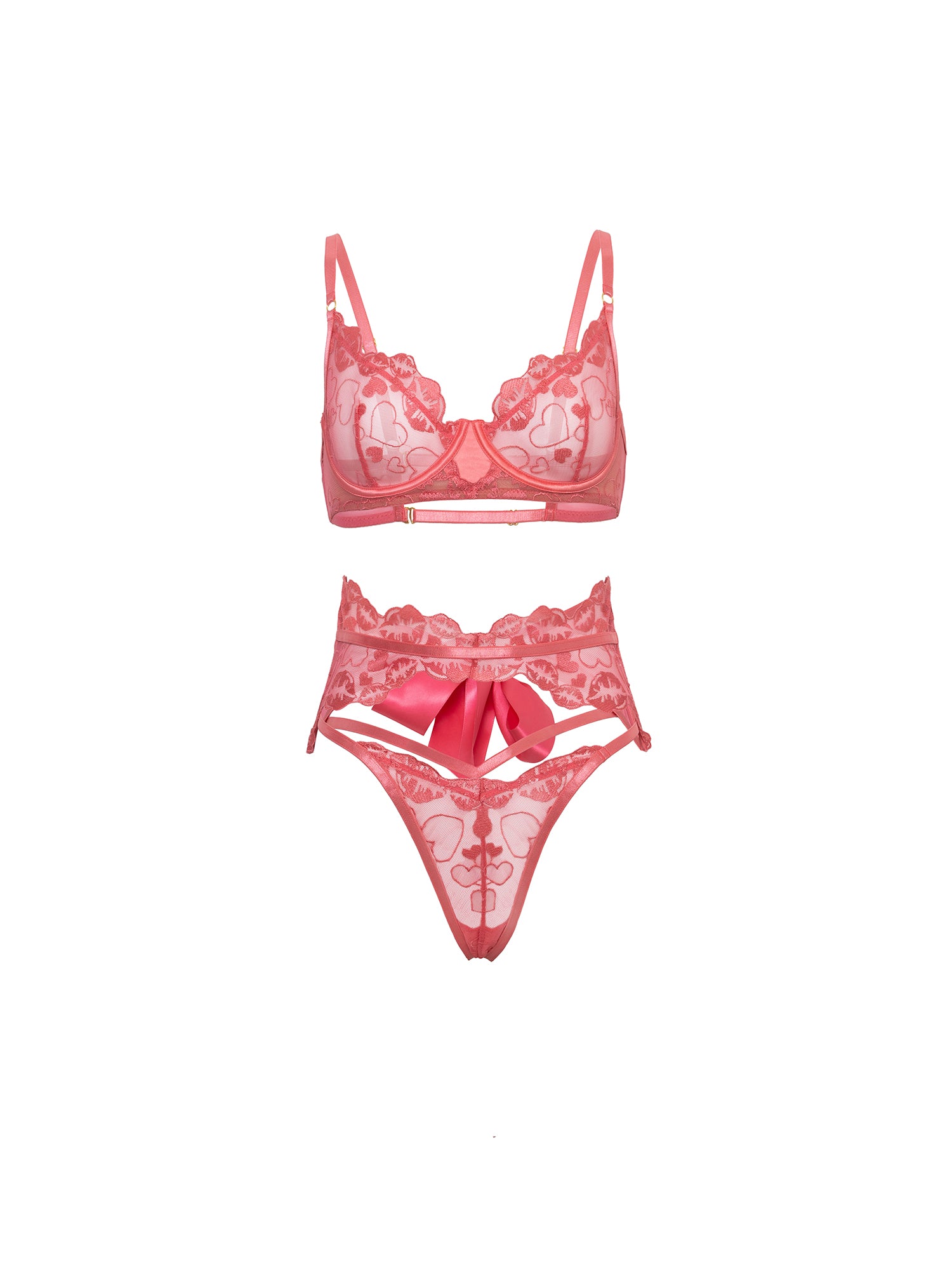 Romantic with a daring twist, the Alicia Sheer 3 Piece Bra Set turns classic lace into a head-turning statement. This unlined underwire set features soft mesh cups embroidered with elegant patterns, paired with a matching G-string and a coordinating sheer belt that adds a sultry finishing touch. A large satin bow at the back steals the spotlight, making Alicia the perfect blend of feminine charm and bold allure.