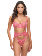 - Three-piece set with sheer embroidered bra, G-string, and a belt