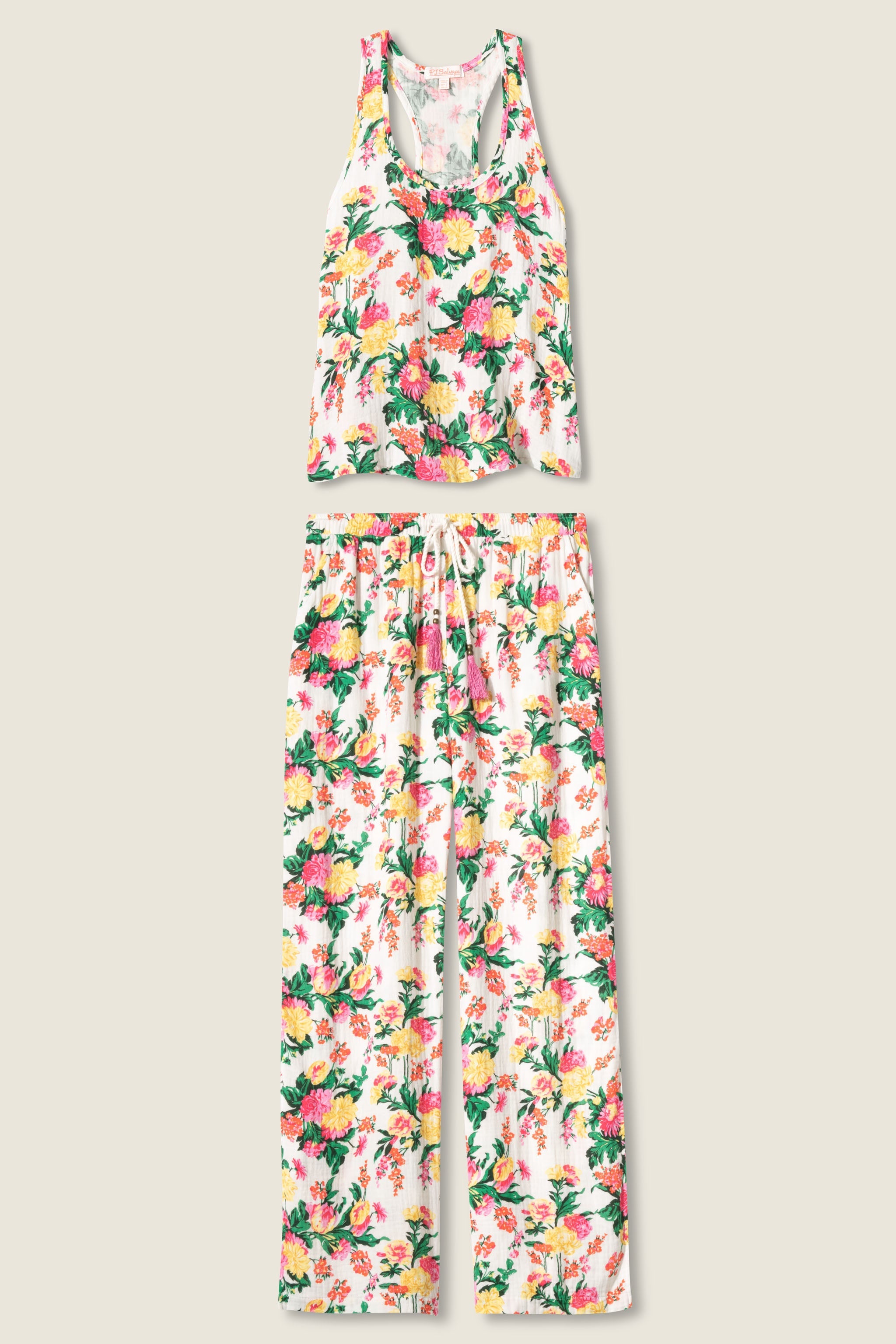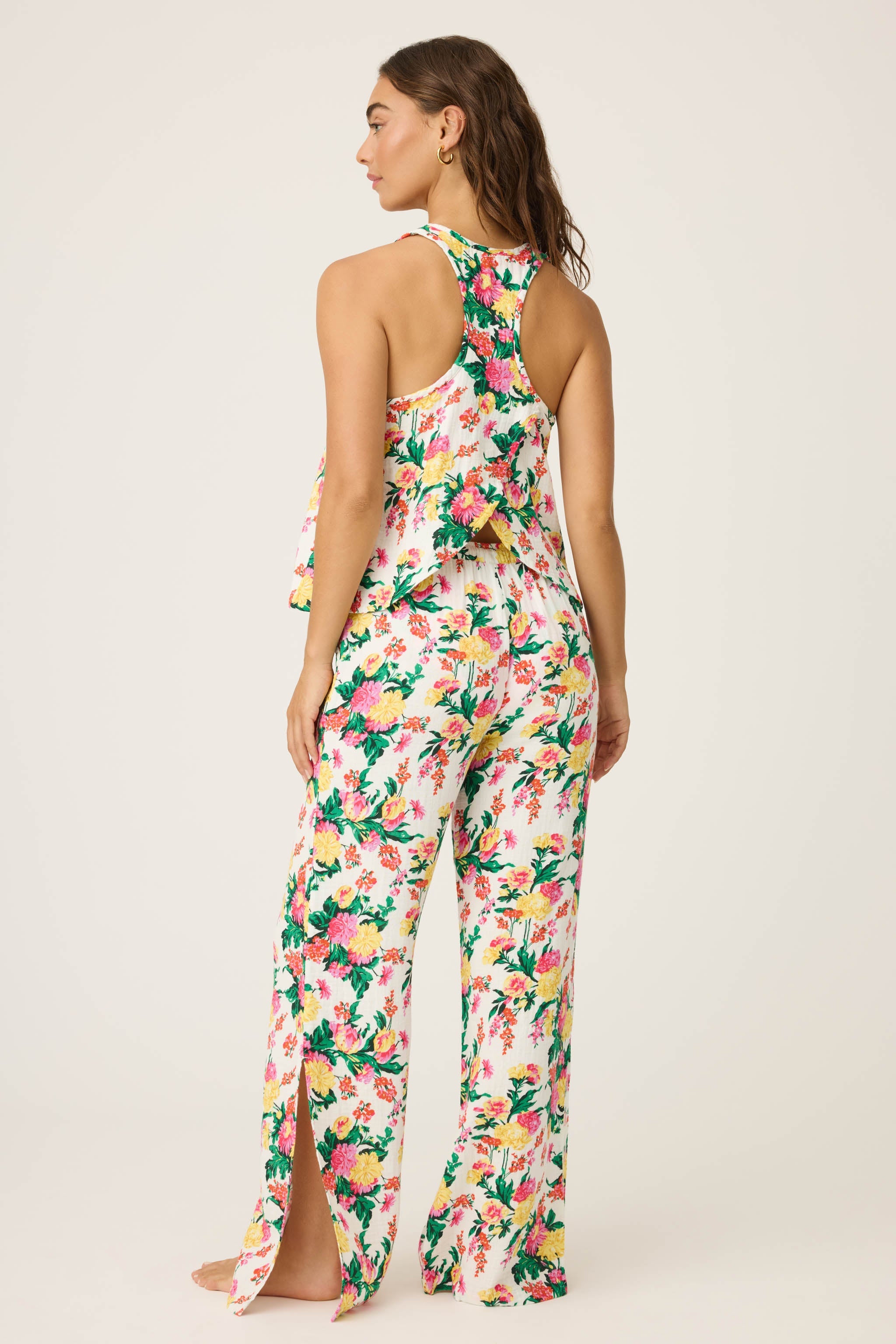 Your sunny escape starts here. This floral set is made for vacation days and relaxed mornings alike, with a scoop-neck racerback tank featuring a breezy crossover back, and wide-leg pants finished with side pockets and long hem slits for added movement. Crafted from lightweight crinkled gauze, it’s easy, airy, and perfect for poolside lounging or unwinding after a beach day.