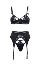 Introducing the Demi Cage Bra Set, the perfect embodiment of luxury and style. The padded shelf cup bra features an exquisite lace overlay and standard adjustable shoulder straps, creating a look that is both glamorous and comfortable. Its matching garter belt and panty are made with stretch satin and galloon lace, and the panty features a cheeky back for a subtly alluring touch.
