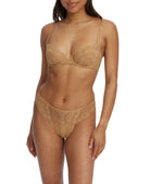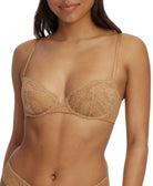 - Scalloped lace frames the open balconette neckline